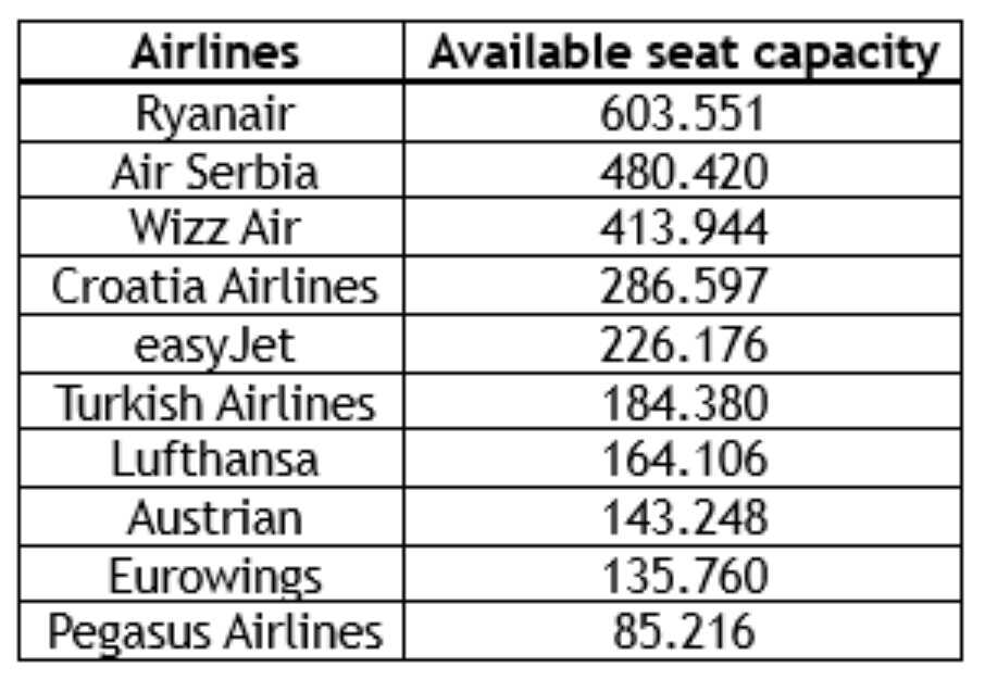 Na temelju dostupnih podataka o planiranom kapacitetu sjedala. Ryanair će biti na poziciji najvećeg prijevoznika u regiji, ispred kompanija Air Serbia i Wizz Air.