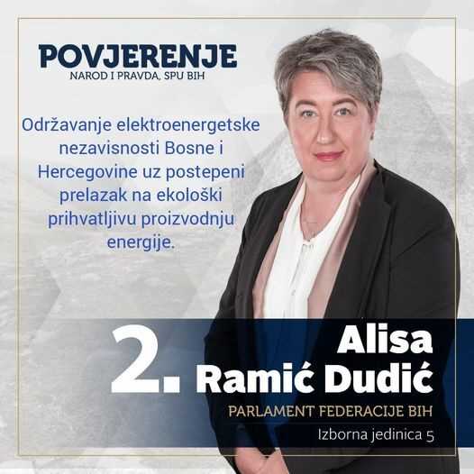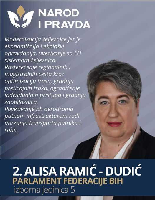 Ja sam Alisa Ramić – Dudić iz Tešnja. Na Općim izborima 2022. kandidatkinja sam na listi koalicije POVJERENJE! (Narod i Pravda i Stranka penzionera/umirovljenika BiH) za Predstavnički dom Parlamenta Federacije Bosne i Hercegovine za izbornu jedinicu 5 (Doboj Jug, Usora, Tešanj, Maglaj, Žepče, Zavidovići, Zenica), i to na poziciji broj 2.