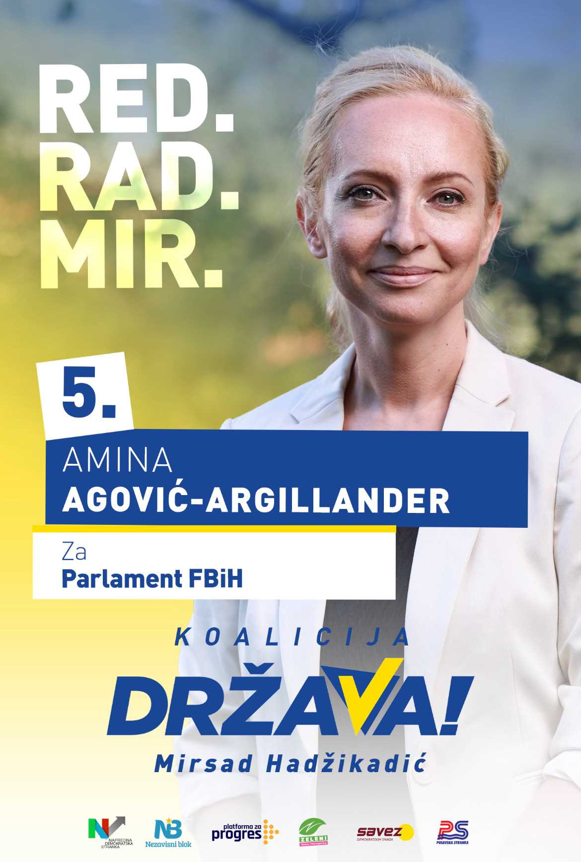 Moje ime je Amina Agović-Argillander i ja sam kandidat iz dijaspore. Kandidatkinja za Parlament FBiH, broj 5, izborne jedinice 406 (Breza, Kakanj, Olovo, Vareš i Visoko) ispred Koalicije Država! - Mirsad Hadžikadić (Platforma za Progres) za predstojeće opće izbore 2022.
