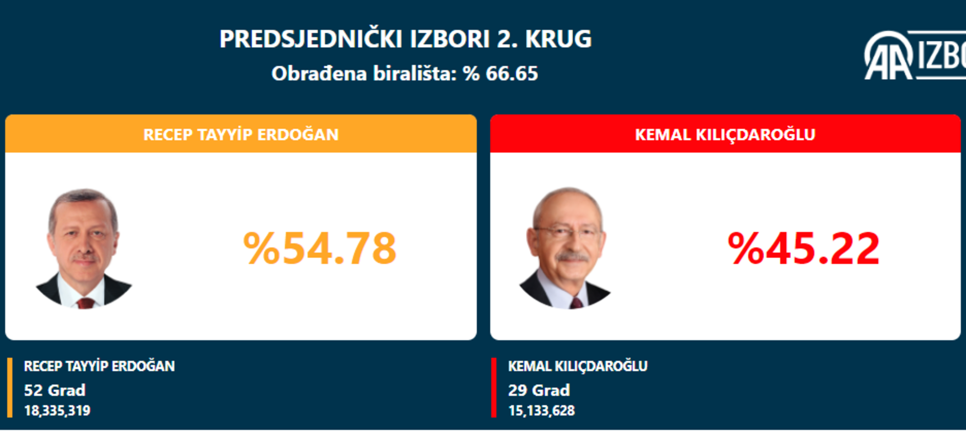 Na osnovu dvije trećine prebrojanih glasova, aktuelni predsjednik Turske Recep Tayyip Erdogan osvojio je 54,78 posto glasova, dok je njegovom izazivaču Kemalu Kilicdarogluu pripalo 45,22 posto glasova.