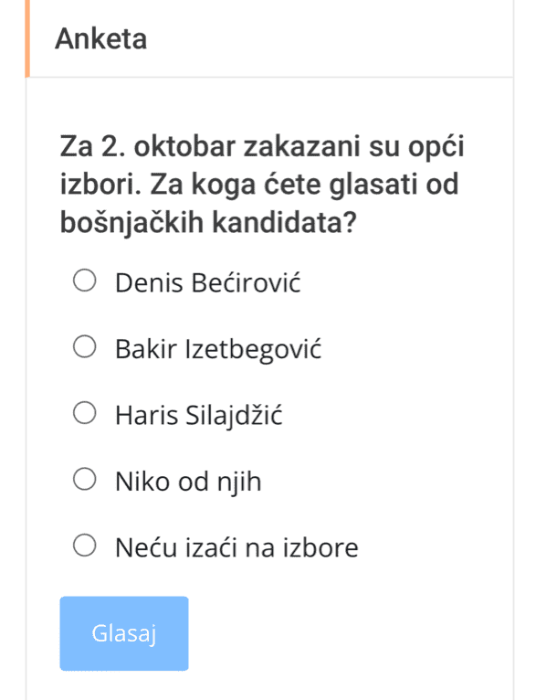 Denis Bećirović, kandidat udružene opozicije, vodi ispred Bakira Izetbegovića u anketi na portalu Politicki.ba za člana Predsjedništva Bosne i Hercegovine ispred bošnjačkog naroda.