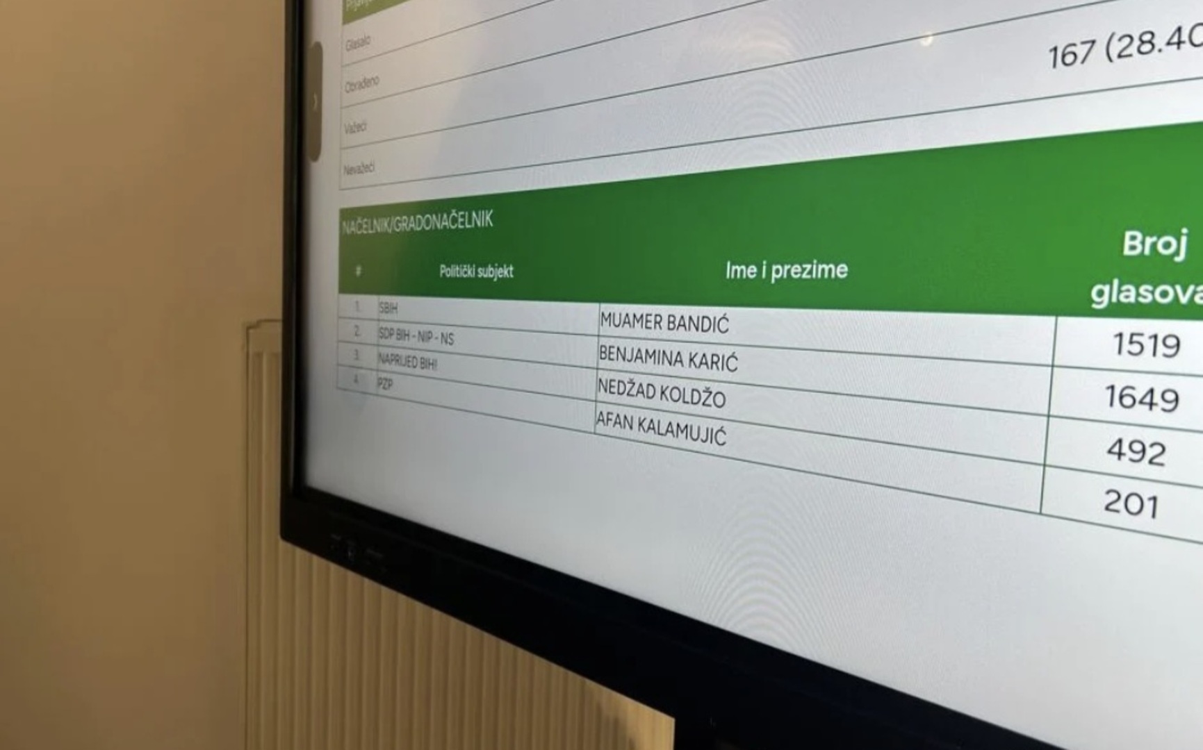 Na osnovu do sada izbrojanih glasova, Karić ima 1.649 glasova dok Bandić ima 1.519 glasova. Trećeplasirani je kandidat stranke Naprijed Nedžad Koldžo (492 glasa), a na posljednjem mjestu je kandidat ZNG-a i PzP-a Afan Kalamujić (201 glas).