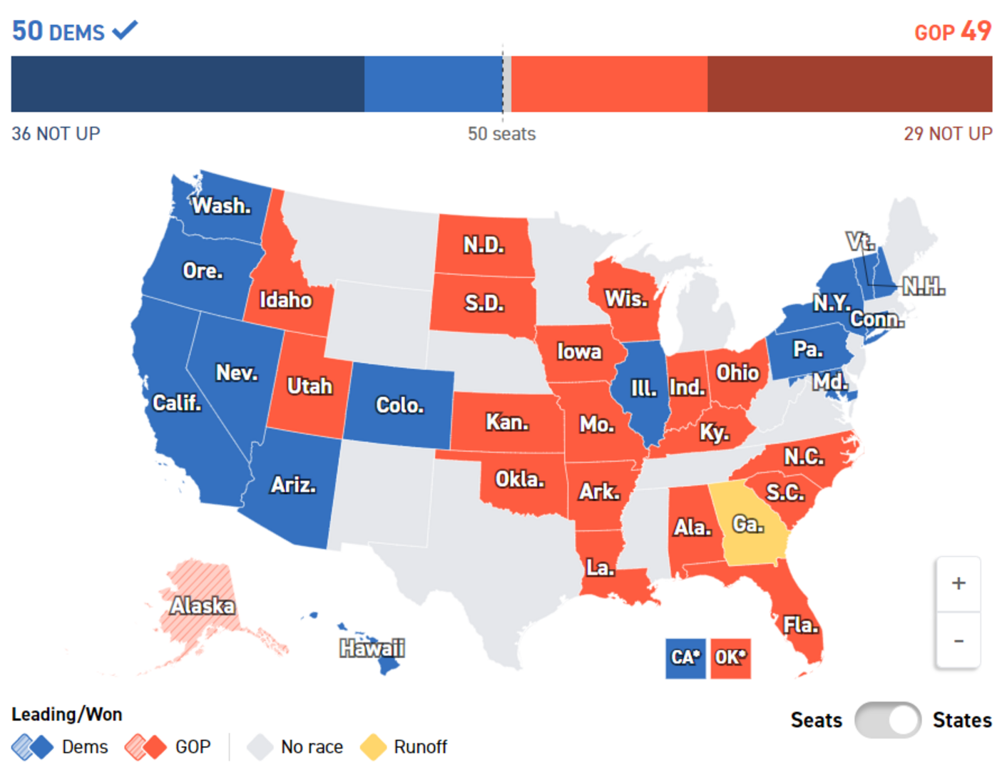 Republikanci su uspješno branili mjesta u teškim trkama na Floridi, Sjevernoj Karolini, Ohaju i Viskonsinu, dok su demokrate zadržale svoja mjesta nakon glasanja u Arizoni, Koloradu, Nevadi i Nju Hempširu.