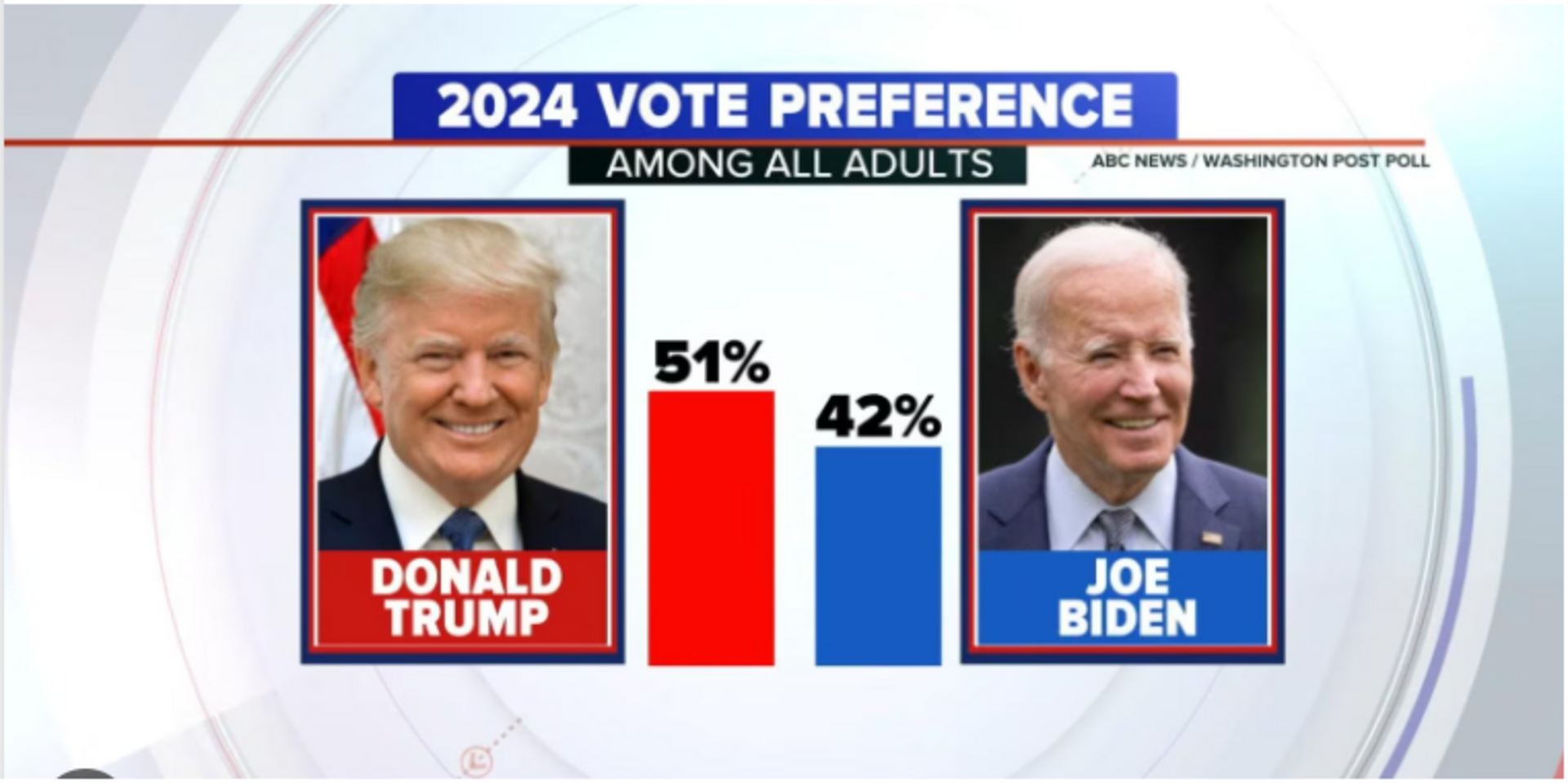 Nedavne ankete pokazuju da bivši predsjednik Sjedinjenih Američkih Država Donald Trump vodi ispred aktuelno predsjednika Joea Bidena u ključnim državama koje će vjerovatno odlučiti o izborima 2024., što ukazuje da Trump nije samo veliki favorit da osigura nominaciju za GOP, već je u jakoj poziciji da povrati Bijelu kuću. Predsjednički izbori u SAD održat će se u utorak, 5. novembra 2024. godine.