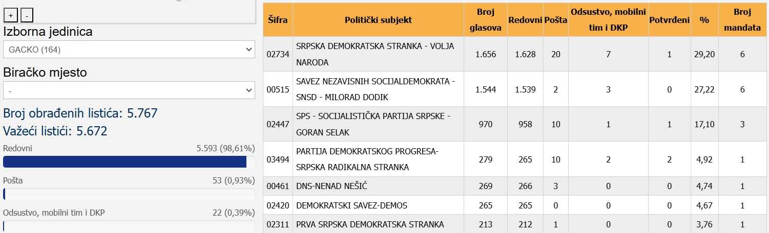 Najviše glasova za lokalni parlament, također, osvojio je SDS, ali daleko od potrebne natpolovične većine.