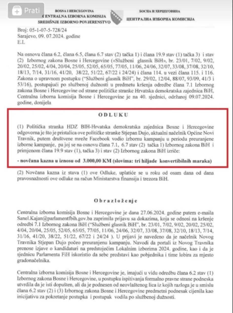Obzirom da se radi o ponavljanju iste greške, CIK je odlučio da PDP mora platiti još po 3.000 KM. Također, sporni sadržaji moraju biti uklonjeni i sa Facebook stranice PDP-a.