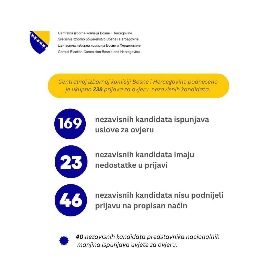 Kod nezavisnih kandidata, njih 23 imaju nedostatke u prijavi. Dodatnih 46 iz ove grupe nisu podnijeli prijavu na propisan način.