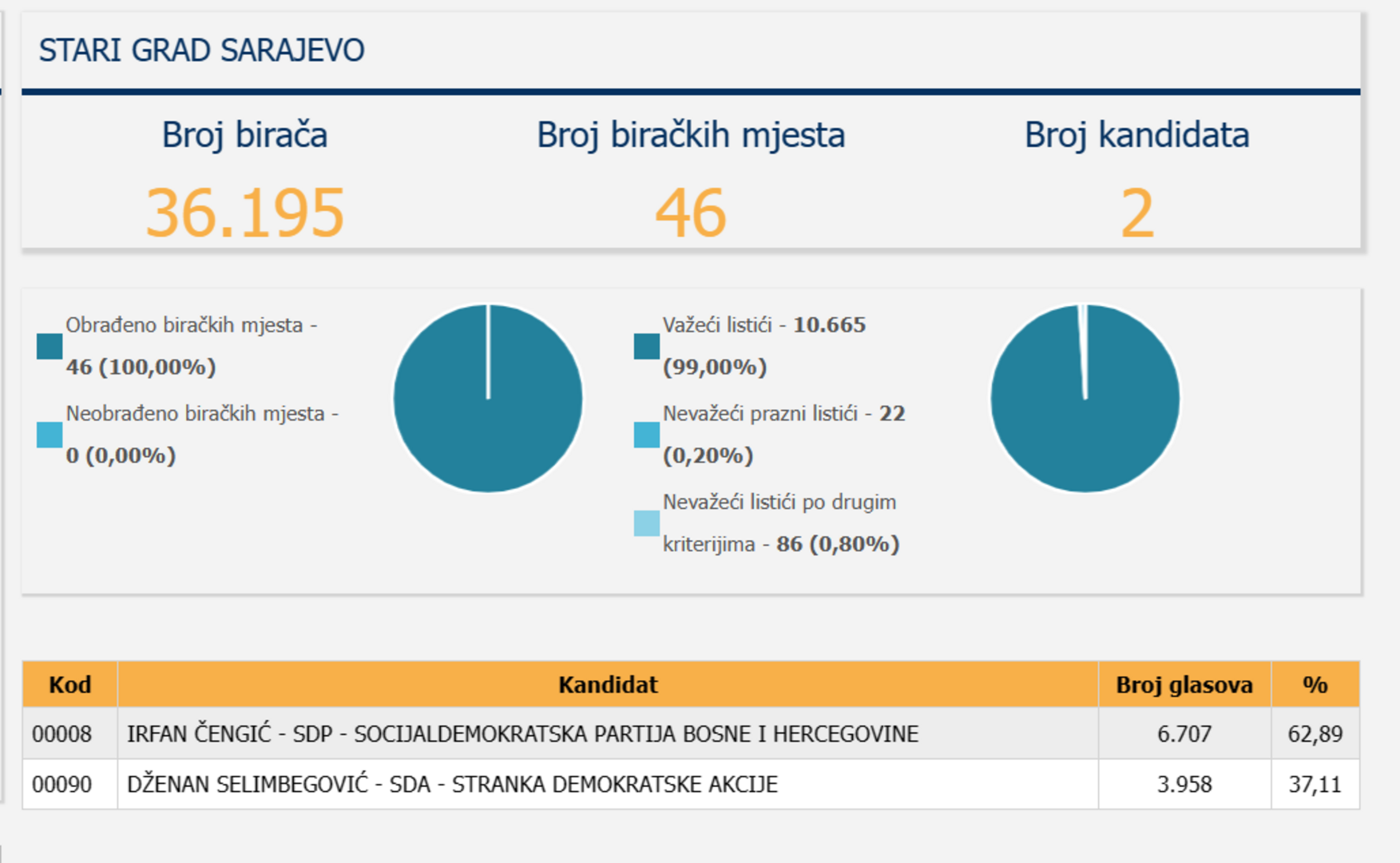 Prema njima pobjednik izbora je Irfan Čengić sa osvojenih 6.707 glasova ili 62, 89%.