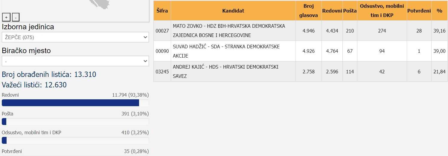 U Žepču je Mato Zovko iz Hrvatske demokratske zajednice Bosne i Hercegovine pobijedio Suvada Hadžića iz SDA.