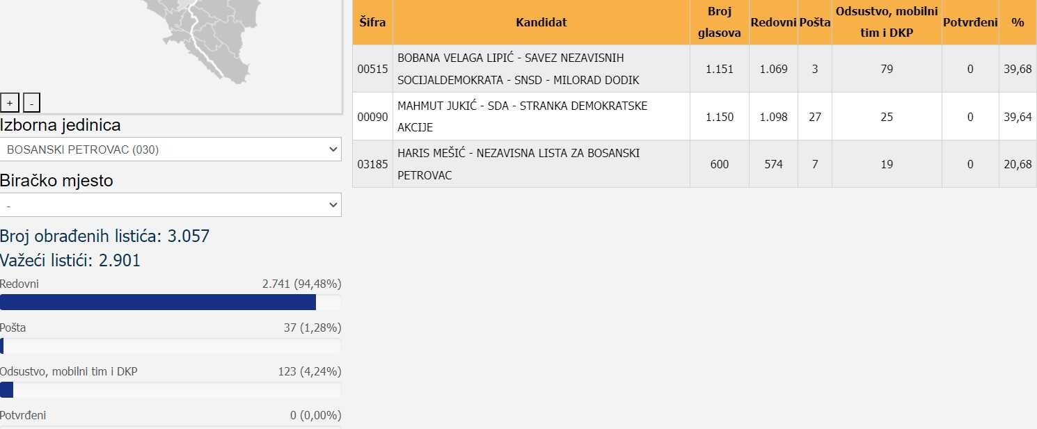 U Bosanskom Petrovcu je kandidatkinja Saveza nezavisnih socijaldemokrata Bobana Velagić Lipić pobijedila Mahmuta Jukića iz Stranke demokratske akcije za 1 glas!
