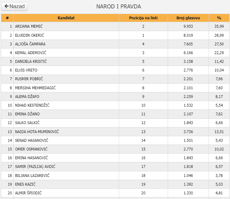 Na listi te partije prva po broju glasova je Arijana Memić sa 9.953 glasa. To je 35,99 posto glasova koje je NiP dobio.