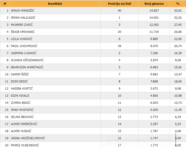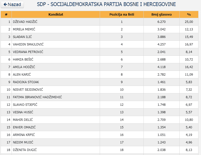 Najviše glasova, odnio je Smajo Mandžić, 14. 827 glasova. Mandžić je, zanimljivo na tu poziciju došao sa posljednjeg, 40. mjesta na listi stranke.