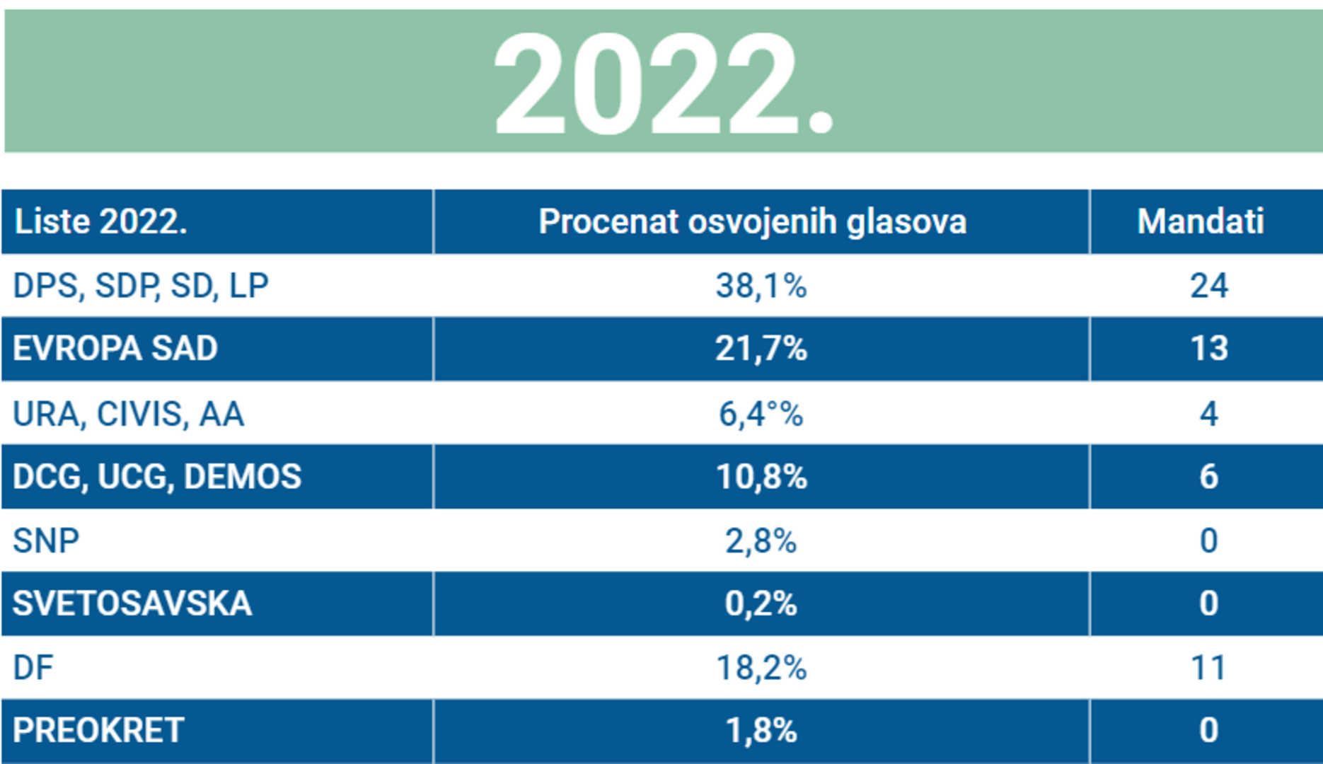 Demokratski front osvojio je 18,2 odsto glasova, Koalicija "Idemo ljudi" okupljena oko Demokrata 10,8, a "Može Podgorica" predsjednika Vlade u tehničkom mandatu Dritana Abazovića oko 6,4 odsto.