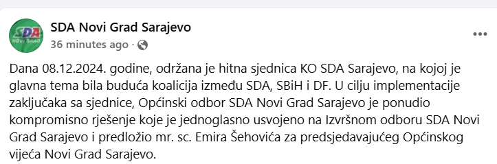 Dana 08.12.2024. godine, održana je hitna sjednica KO SDA Sarajevo, na kojoj je glavna tema bila buduća koalicija između SDA, SBiH i DF.