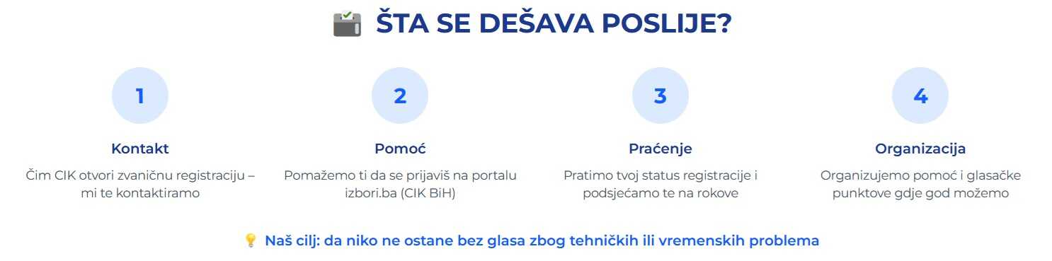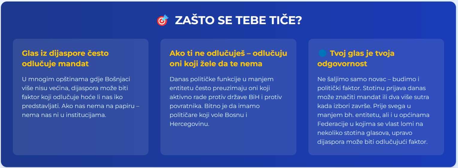 Ključni fokus kampanje jeste pomoći dijaspori da se pravovremeno i ispravno prijavi kod Centralne izborne komisije, a kroz organizirane mobilne timove, obuku volontera i tehničku asistenciju, projekat će omogućiti lakši i sigurniji pristup biračkom pravu.