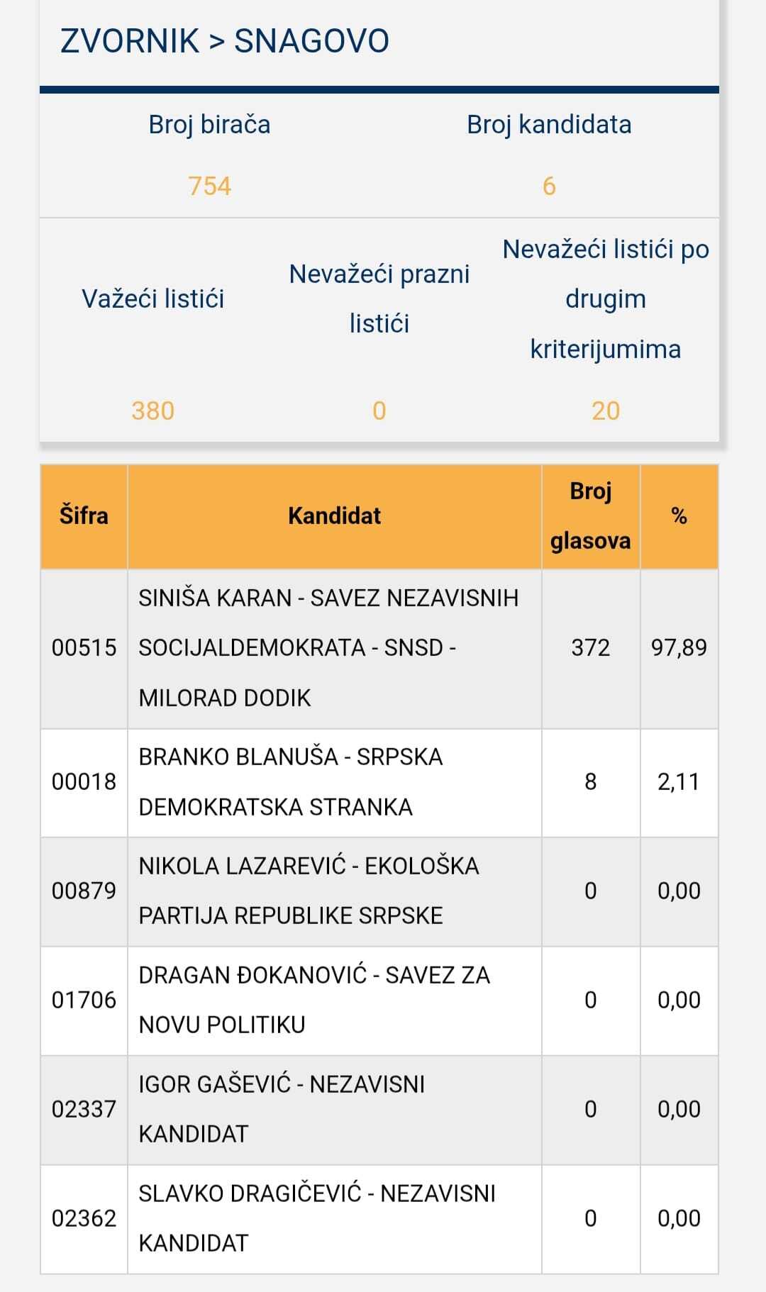 U, ponavljamo, bošnjačkom mjestu Snagovo, kandidat Dodikovog SNSD-a Siniša Karan, osvojio je čak 97,89 posto glasova!