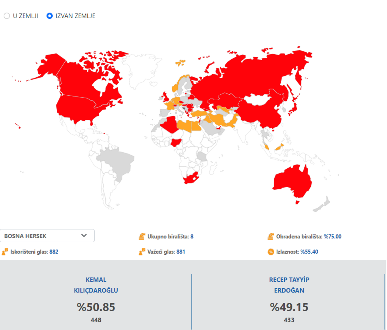 Za aktuelnog predsjednika Republike Turske, kojem se smiješi još jedan petogodišnji mandat, glasalo je 448 turskih državljana koji žive u BiH. Time je Erdogan dobio 50,85 glasova