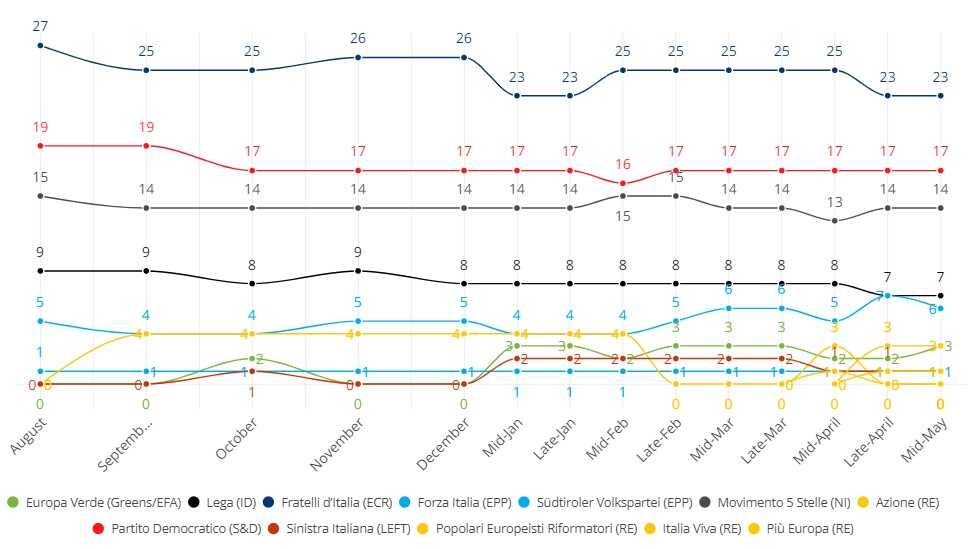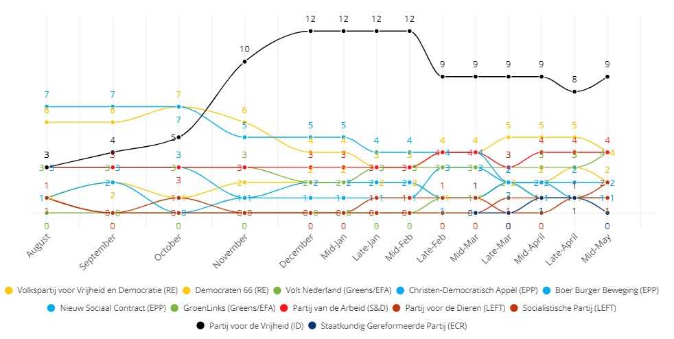 Socijalisti i Demokrati (S&D) su u stabilnom padu, dok ekstremni desničari (ID) sigurno, mada postepeno, rastu.