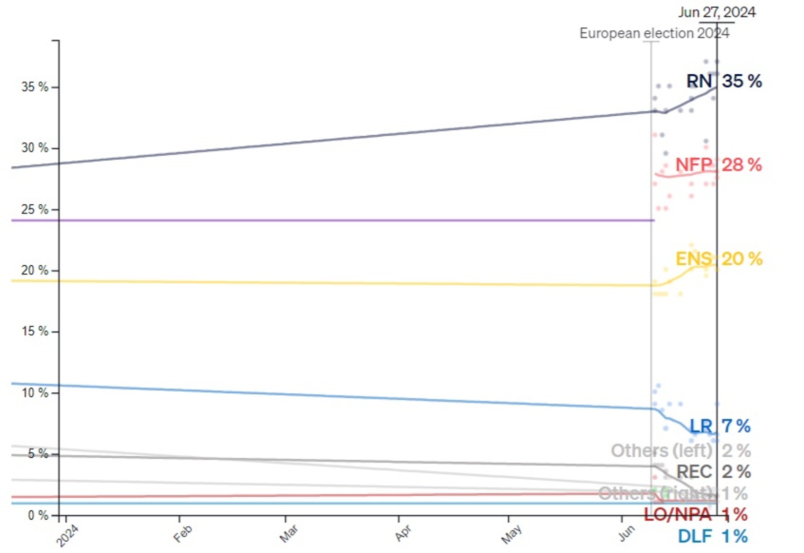 Francuski premijer Gabrijel Atal upozorio je da bi eventualna pobjeda Le Pen dovela do "mržnje i agresije", ali rezultati anketa ukazuju na to da njena stranka koju formalno vodi dvadesetosmogodišnjeg Jordana Baredelle, koji bi mogao biti novi premijer, čvrsto drži vodeću poziciju.