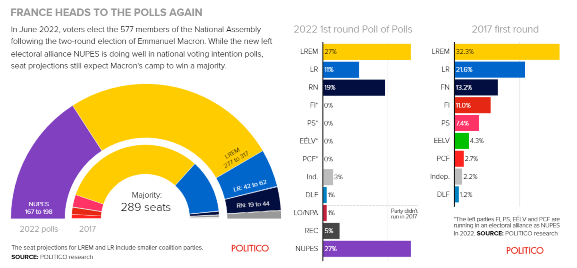 Prema istraživanjima javnog mnjenja, glavni takmaci su blok predsjednika Emmanuela Macrona Ensamble i široki lijevi savez NUPES, kojeg predvodi Jean-Luc Melenchon.