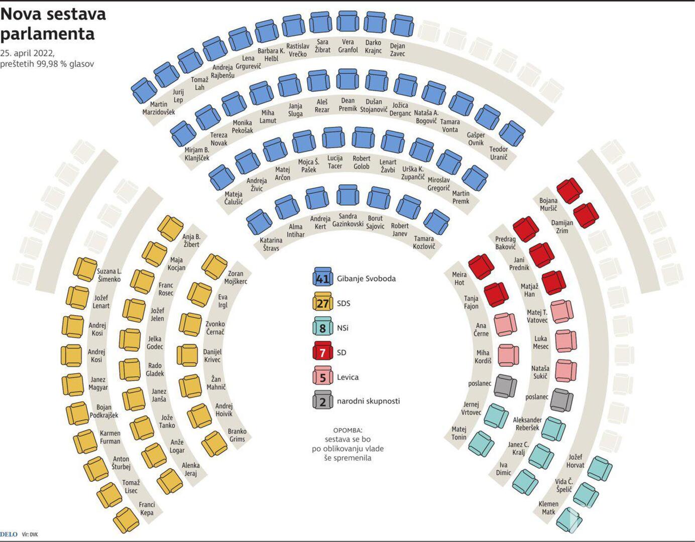 U novom sazivu parlamenta Ljevica bi trebala imati pet mandata: Ana Černe (bivša partnerica Luke Mesca), koja je slavila u Kranju, i bivši poslanik Miha Kordiš , koji je uvjerio najveći broj birača u Škofja Loki, Matej Tašner Vatovec (Koper 1), Luka Mesec (Ljubljana Centar) i Nataša Sukič (Ljubljana Bežigrad), piše Delo.