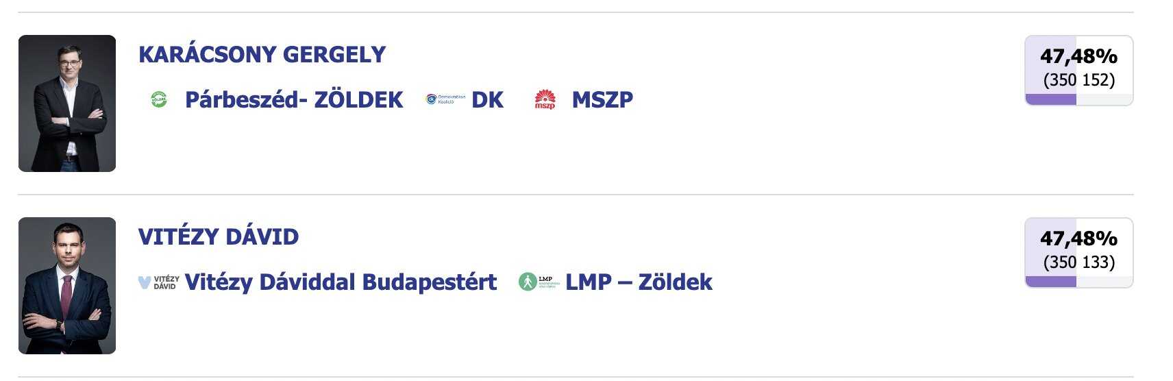 Njegov izazovač, formalno kandidat Stranke Zelenih Mađarske, David Vitezi, i familijarno povezan sa Viktorom Orbanom, osvojio je 350.133 glasa.