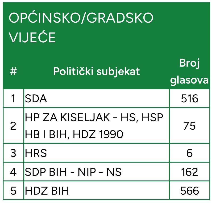 Izlaznost u Kiseljaku je tek 45,34 posto. Glasalo je 8.073 birača.