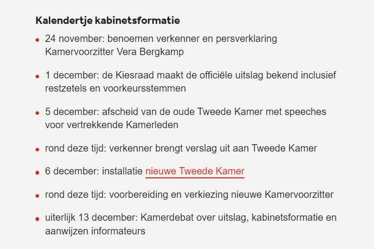 Predsjednici i predstavnici PVV-a, VVD-a, NSC-a i BBB-a pozvani su na sastanak s Predsjednicom Predstavničkog doma Verom Bergkamp kako bi razgovarali o principima funkcioniranja nove vlasti.
