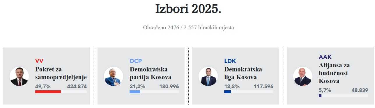 Nakon obrade oko 95 posto biračkih mjesta širom zemlje, LVV je osvojio nešto manje od 50 posto. S ovim postotkom, ova stranka će dobiti i više od 55 mjesta u Skupštini Kosova, koja broji 120 mandata i može stvoriti potrebnu većinu od 61 mjesta samo uz saradnju sa strankama iz nevećinskih zajednica.