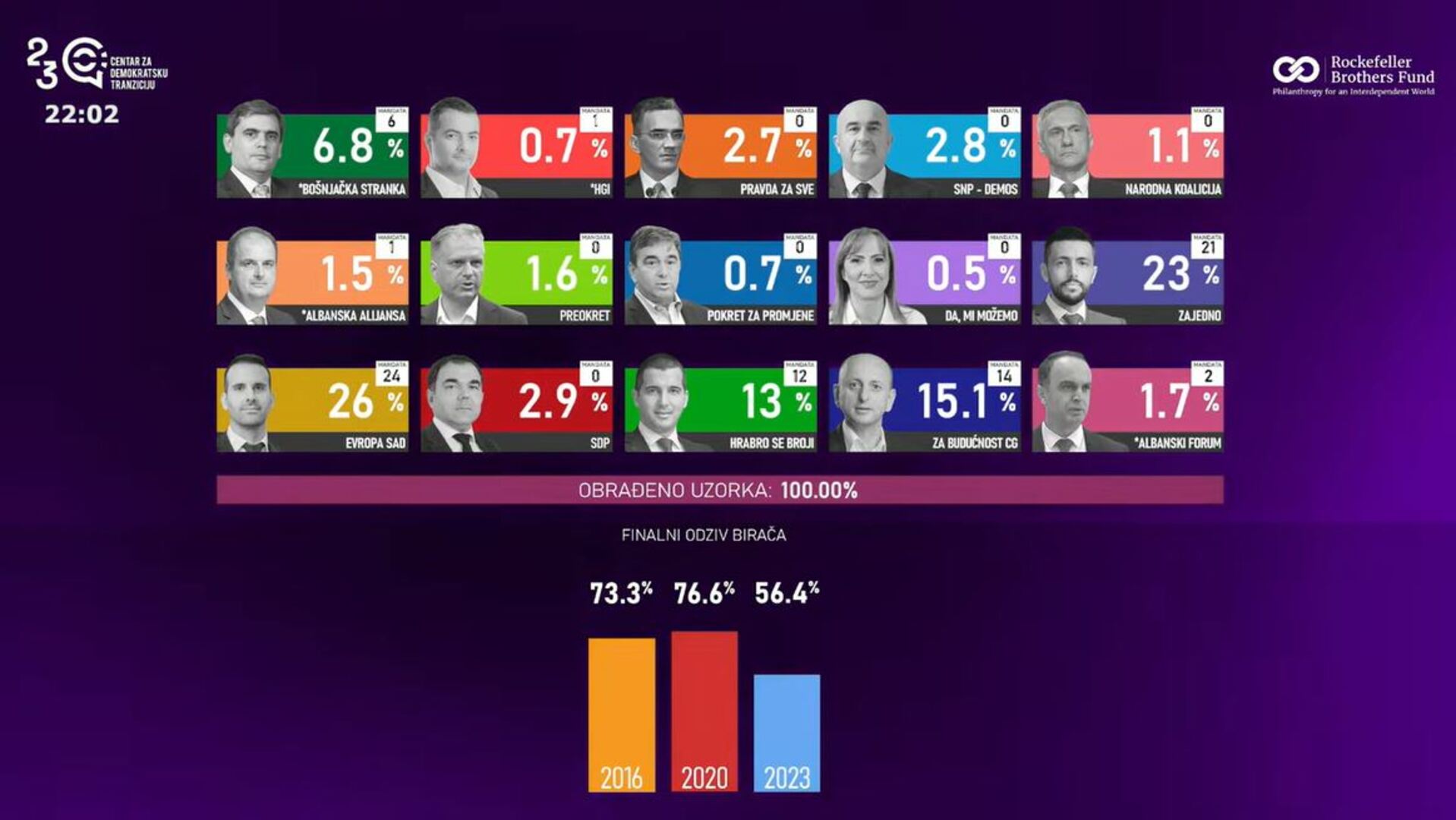 Podaci Centra za monitoring i istraživanje (CeMI), na osnovu 99 odsto obrađenog uzorka pokazuju da je PES osvojio je 25,6 odsto glasova, koalicija DPS-SD-LP-DUA osvojila je 23,7 odsto, ZBCG (NSD-DNP) 14,8, koalicija "Hrabro se broji" (Demokrate-URA) 12,3 odsto...
