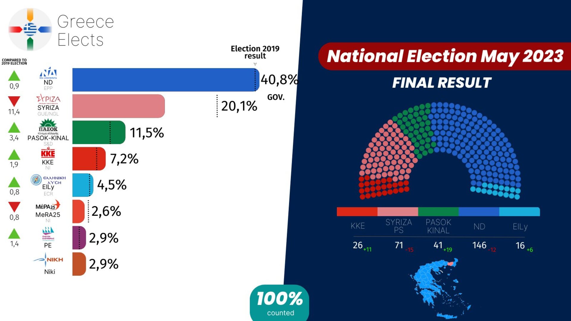 Komunistička partija Grčke (KKE) osvojit će između 7,2 i 9,2 odsto glasova (21), dok će stranka Spartanci dobiti podršku između četiri i šest odsto birača (13).