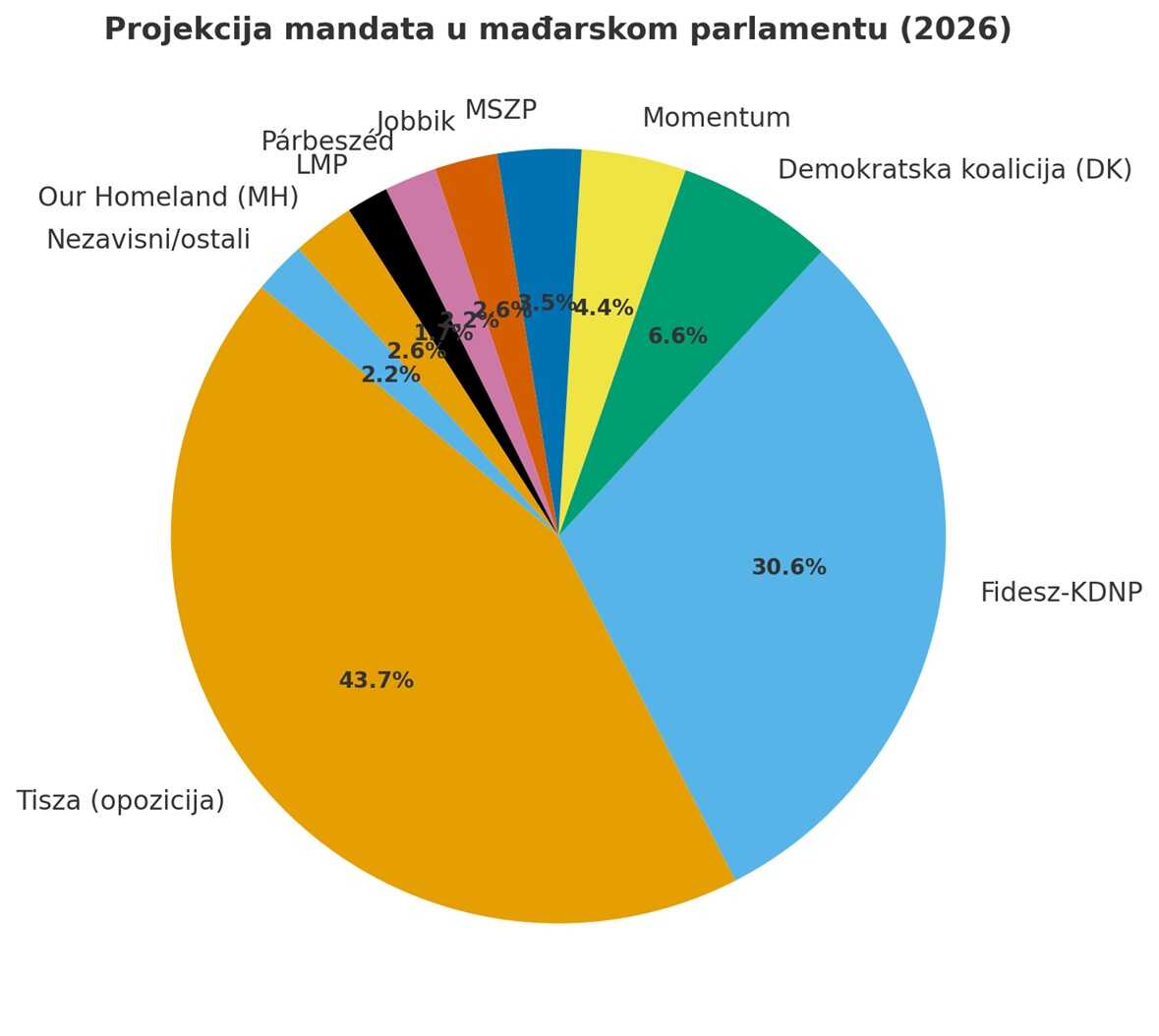 Mađarski parlament broji 199 zastupnika, a prema trenutnim anketama i simulacijama rezultata, projekcija raspodjele mandata nakon izbora 2026. godine izgleda ovako: