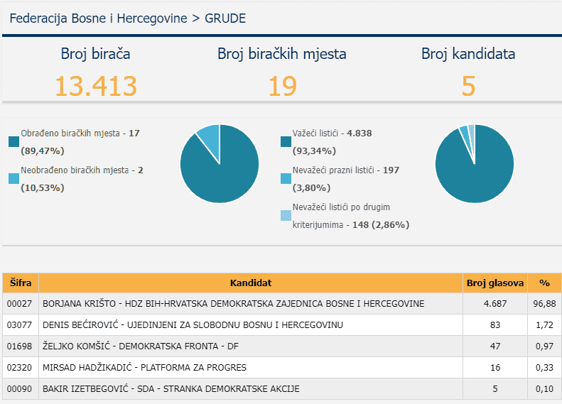 U Grudama, općini s bezmalo 100 procenata Hrvata, Bakir Izetbegović (SDA) dobio je 5 glasova, pokazuju podaci Centralne izborne komisije.