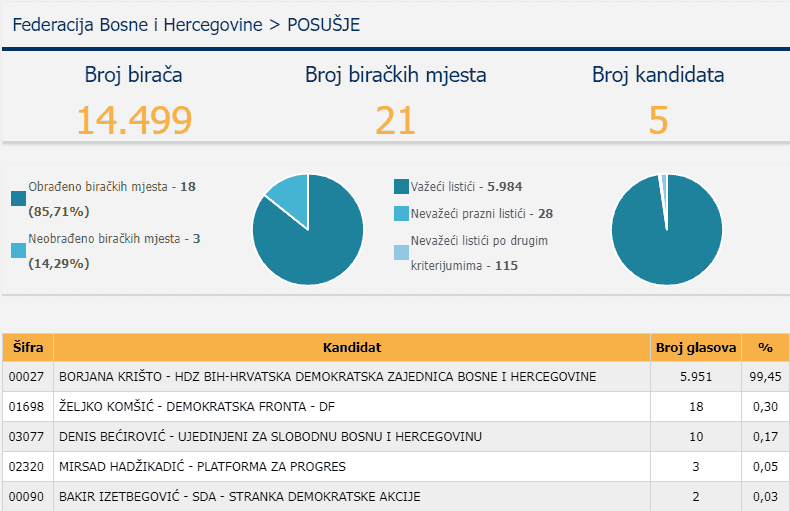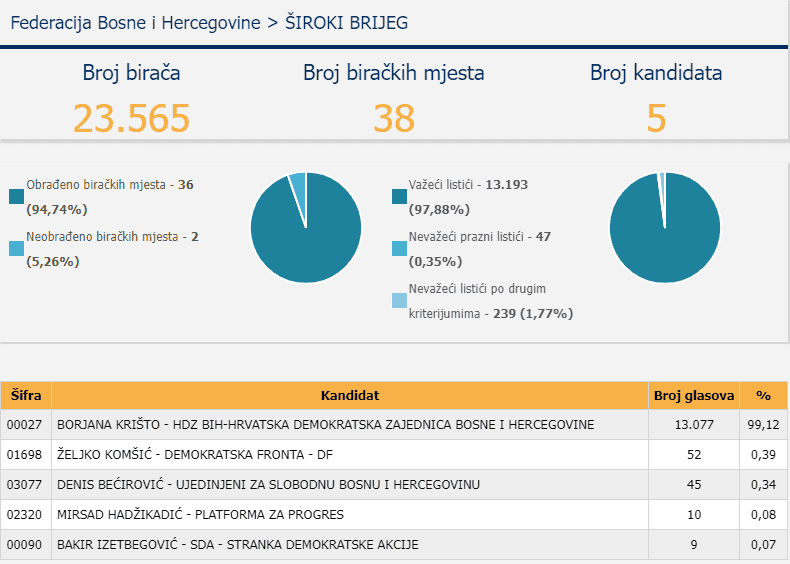 U Širokom Brijegu, još jednoj predominantnoj općini s hrvatskim stanovništvom, Izetbegović ima 9, Hadžikadić 10, Bećirović 45, a Komšić 52 glasa.