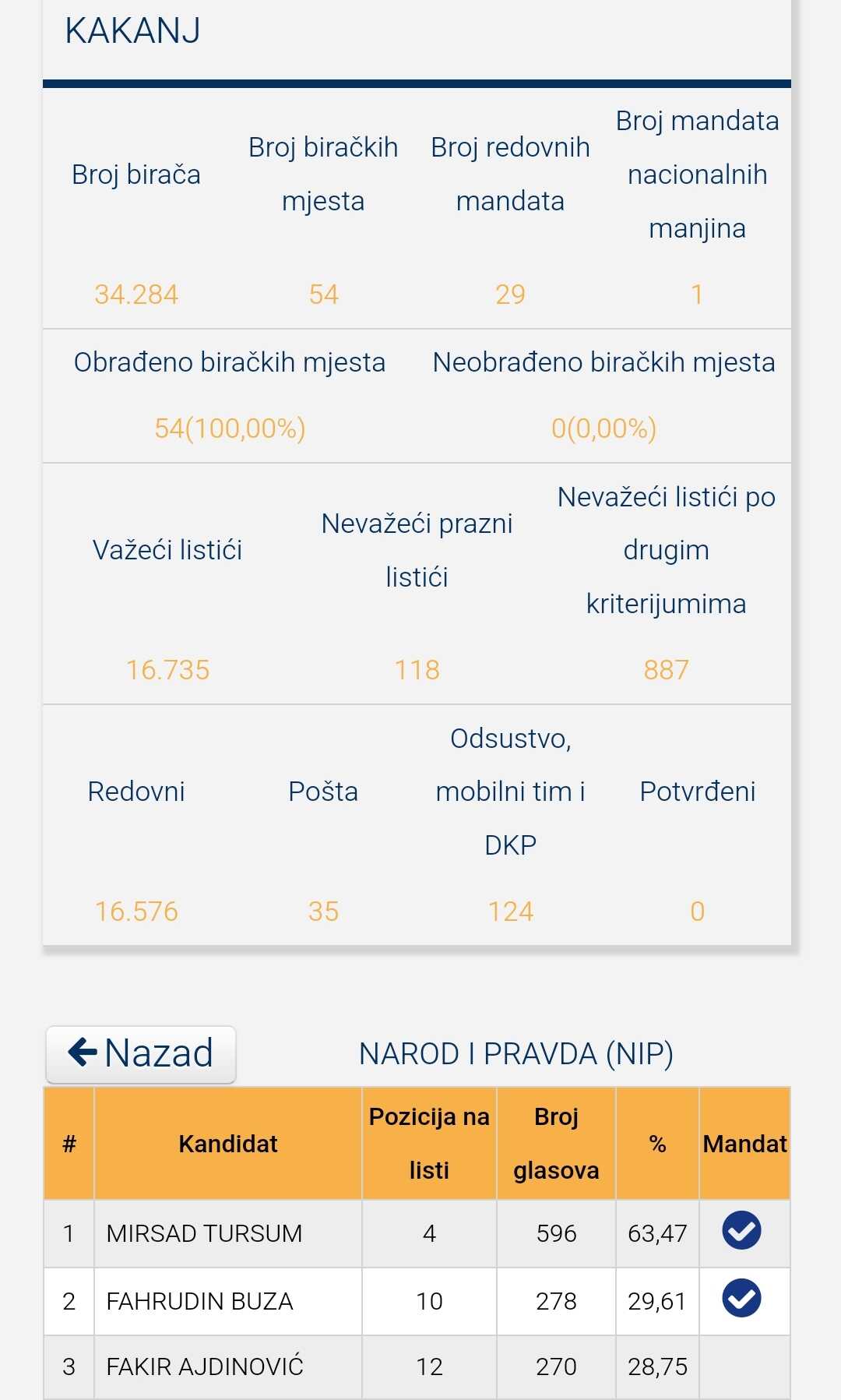 Kandidat NiP-a za Općinsko vijeće Kakanj, Fakir Ajdinović, nije uspio dobiti mandat vijećnika, prema utvrđenim rezultatima Lokalnih izbora.