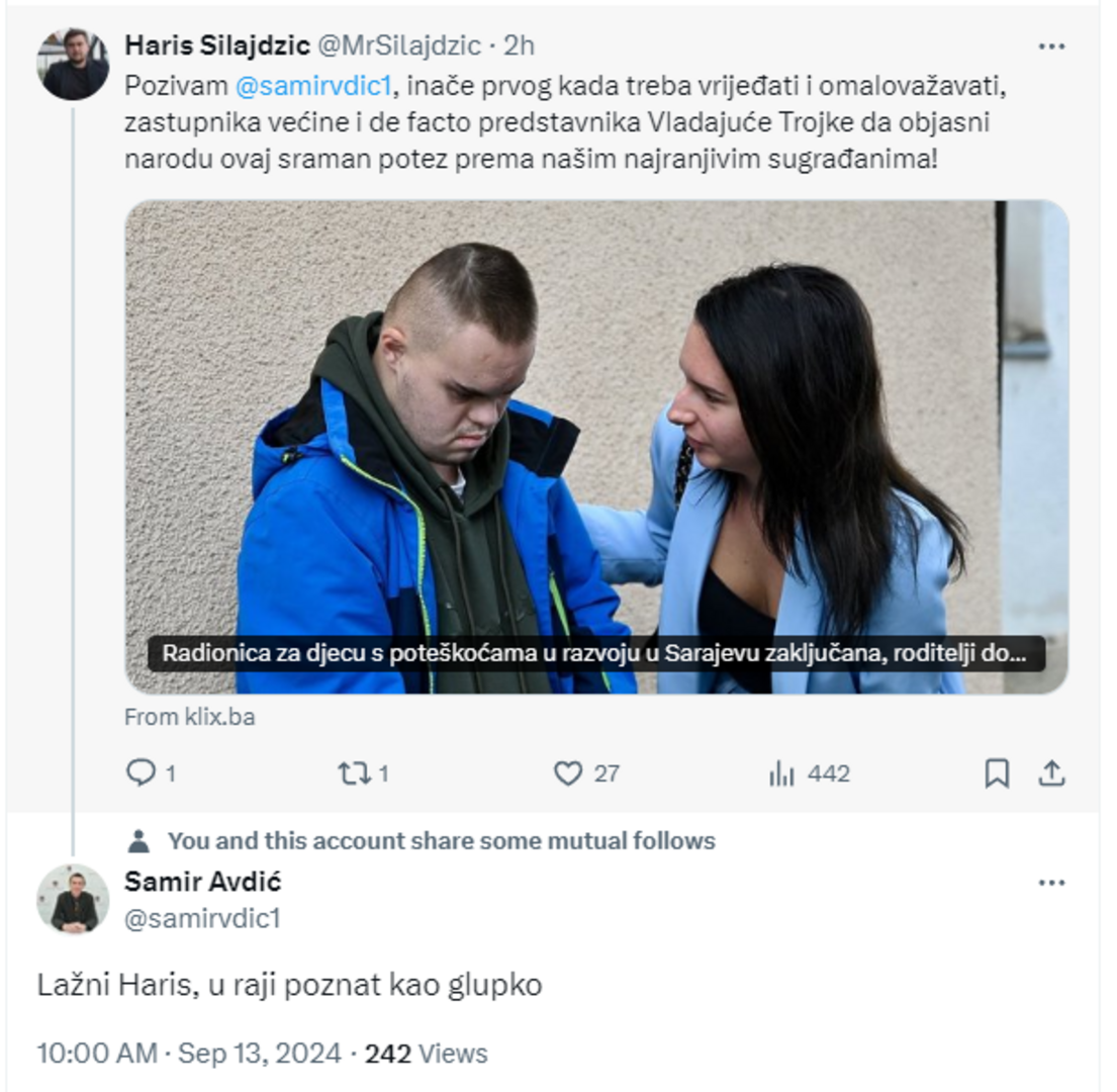"Pozivam Samira Avdića, inače prvog kada treba vrijeđati i omalovažavati, zastupnika većine i de facto predstavnika Vladajuće Trojke da objasni narodu ovaj sraman potez prema našim najranjivim sugrađanima!", napisao je federalni zastupnik Stranke za BiH Haris Silajdžić na svom Twitterr profilu.
