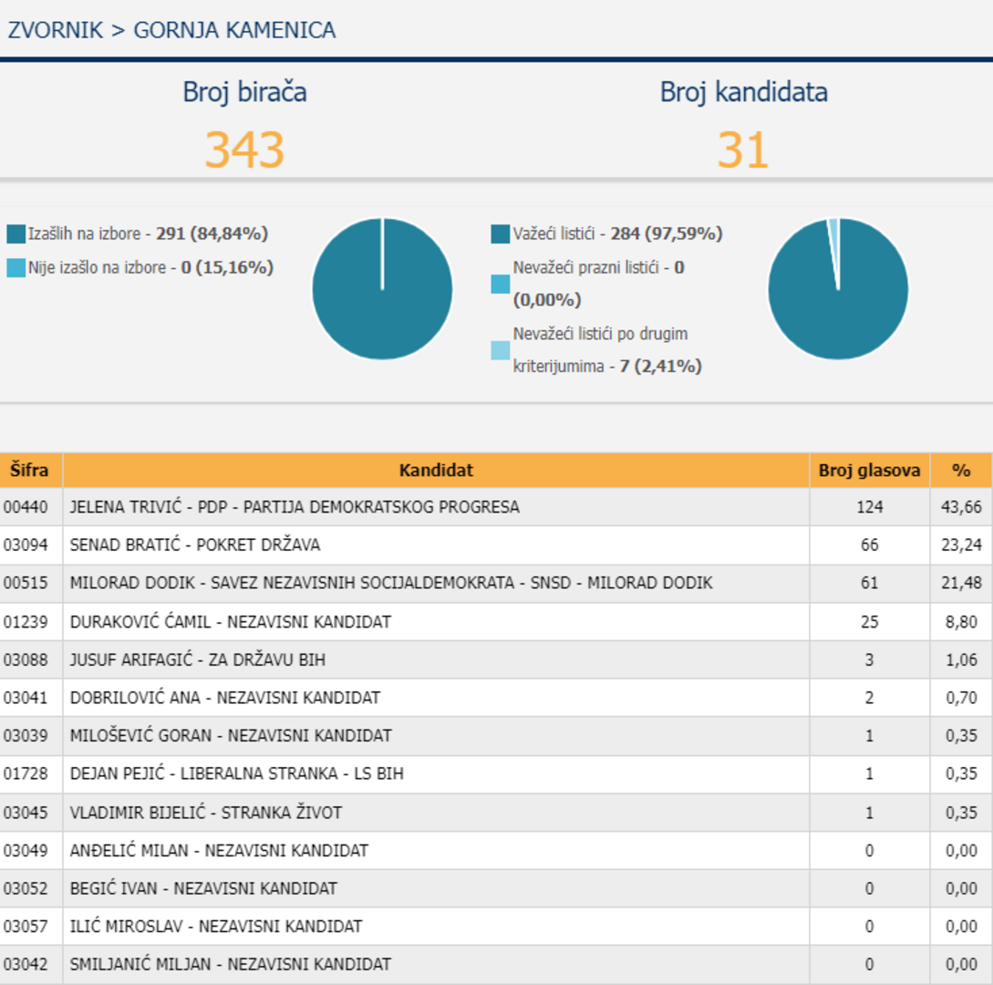 Tako je na glasačkom mjestu u Gornjoj Kamenici, prema izvještaju CIK-a, od upisanih 343 glasača na glasanje izašlo njih 291, od kojih je 124 za predsjednika/cu Rs povjerenje dalo Jeleni Trivić, a 61 Miloradu Dodiku.
