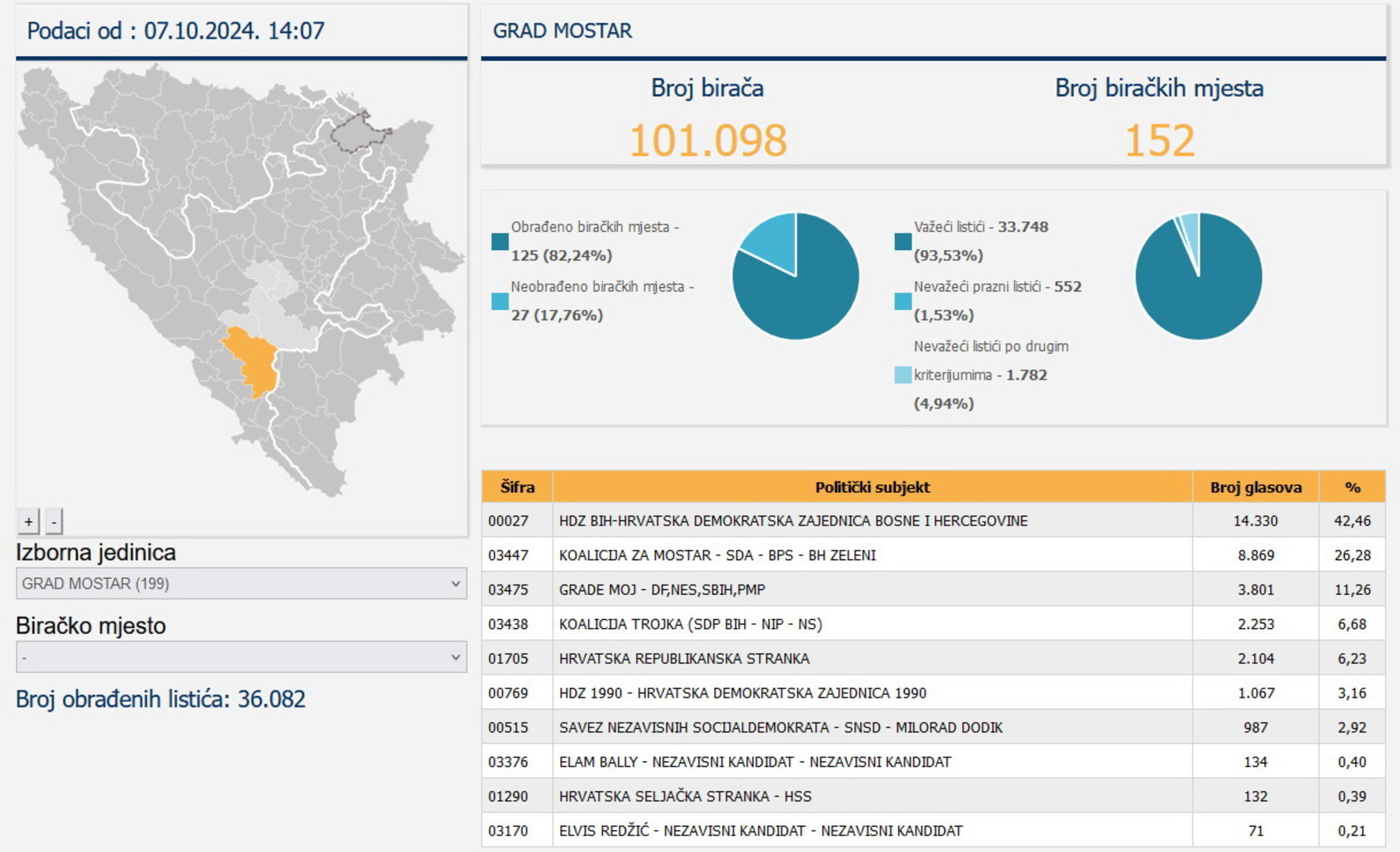 Nakon obrađenih glasačkih listića sa 82,24% posto odnosno sa 125 biračkih mjesta HDZ BiH je trenutno na prvom mjestu za Gradsko vijeće Mostara s osvojenih 42,46, tačnije, 14.330 glasova.