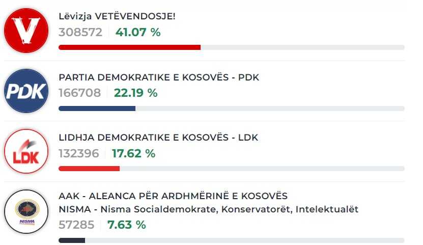 Prema ovim podacima, Pokret Samoopredeljenje (LVV) osvojio je 41,09% glasova, Demokratska partija Kosova (PDK) 22,15%, Demokratski savez Kosova (LDK) 17,64%, Alijansa za budućnost Kosova (AAK) u koaliciji sa Socijaldemokratskom partijom Kosova i još nekim manjim strankama i udruženima 7,63%.