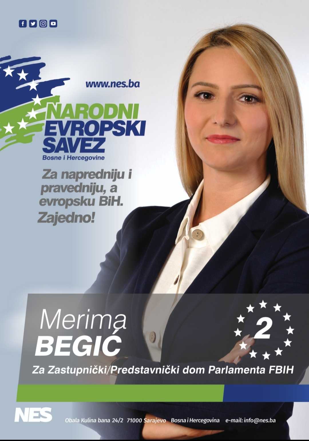 Merima Begić se zovem, kandidatkinja sam NES-a ( Narodni evropski savez )za Predstavnički dom Parlamenta FBiH, Izborna jedinica broj 9, Hercegovačko - neretvanski kanton. Na kandidatskoj listi za ovaj nivo vlasti u mojoj izbornoj jedinici sam na broju 2.