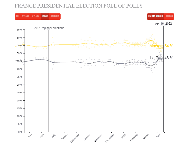 Liderka Nacionalnog skupa pokušala je stranku okrenuti ka mejnstrimu, preimenujući je i ublažavajući njenu antiimigrantsku retoriku. Ankete pokazuju da je ona postigla određeni uspjeh i da Francuzi nisu toliko uplašeni kao prije mogućnošću da Le Pen bude predsjednica. U drugom krugu sljedeće nedjelje, anketa Politicoa predviđa da će Macron dobiti 53 posto glasova u odnosu na 47 posto Le Penovih - daleko više od 34 posto koliko je osvojila na izborima 2017. protiv njega.