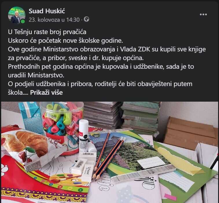 1. Udžbenike za prvi razred za sve đake u Tešnju i cijelom kantonu nabavilo je Ministarstvo obrazovanja, ne Općina Tešanj. Općina Tešanj je pet godina do sada kupovala udžbenike i oni su redovno korišteni, a ove godine Općina Tešanj je kupila pribor, sveske... To smo više puta javno ponovili. Vrijednost udžbenika za Tešanj, prema mojim informacijama, je oko 50.000 KM.