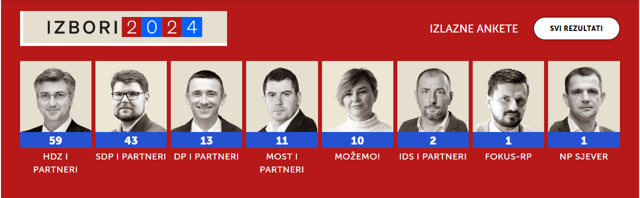 Stigli su novi rezultati izbornih anketa: HDZ ima 59, SDP 43, Domovinski pokret 13, Most 11, Možemo! 10, IDS 2, i Matija Posavec i Fokus po 1, javio je Jutarnji list.