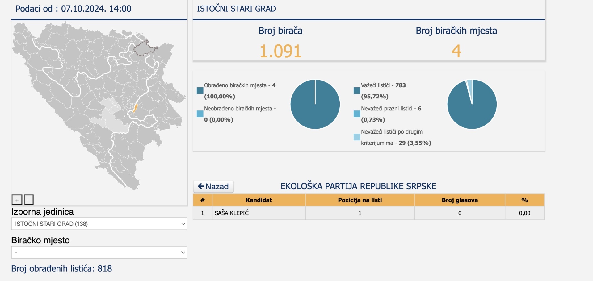 U istoj gradskoj opštini – Istočnom Starom Gradu kandidat Ekološke partije Saša Klepić nije dobio nijedan glas.