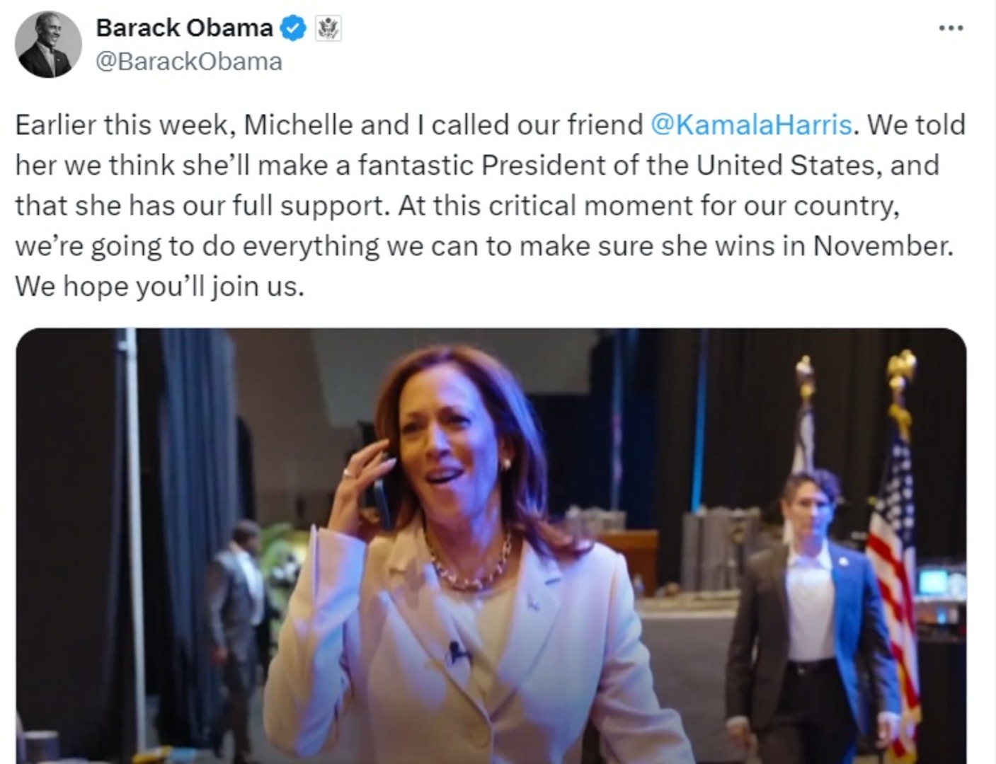 Saopćenje je popraćeno snimkom na kojem Harris preuzima telefonski poziv od Obame u kojem bračni par obećava svoju podršku.