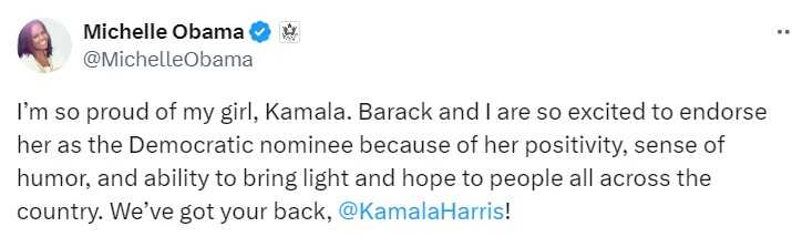 Bivši predsjednik Obama i bivša prva dama Michelle Obama rekli su u zajedničkoj izjavi da vjeruju da Harris ima "viziju, karakter i snagu koju zahtijeva ovaj kritični trenutak".