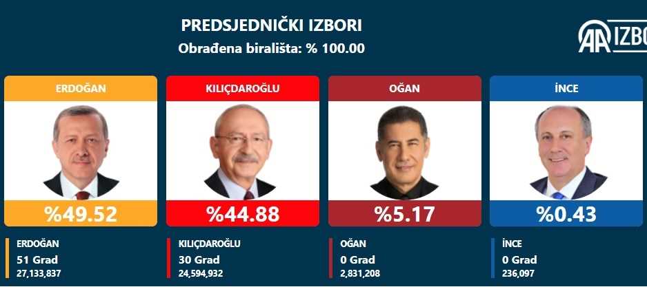 Prema podacima Anadolije, preuzetim iz državne izborne komisije, Recep Tayyip Erdogan osvojio je 49,52 odsto glasova.