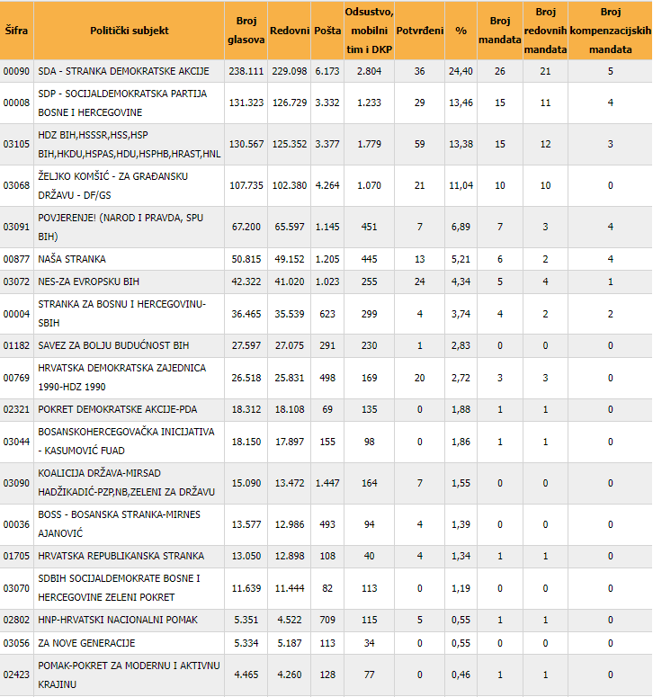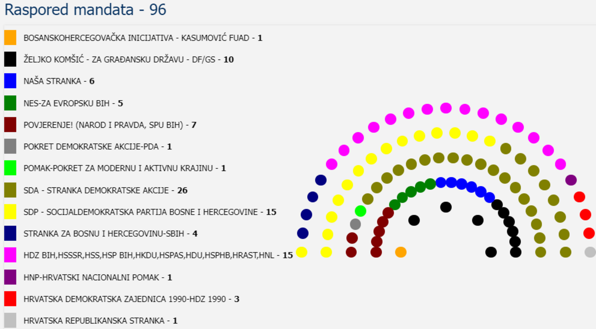 Prema objavljenim nepotvrđenim konačnim rezultatima, SDA će imati 26 poslanika, SDP 15, koliko će brojati i blok oko HDZ BiH.