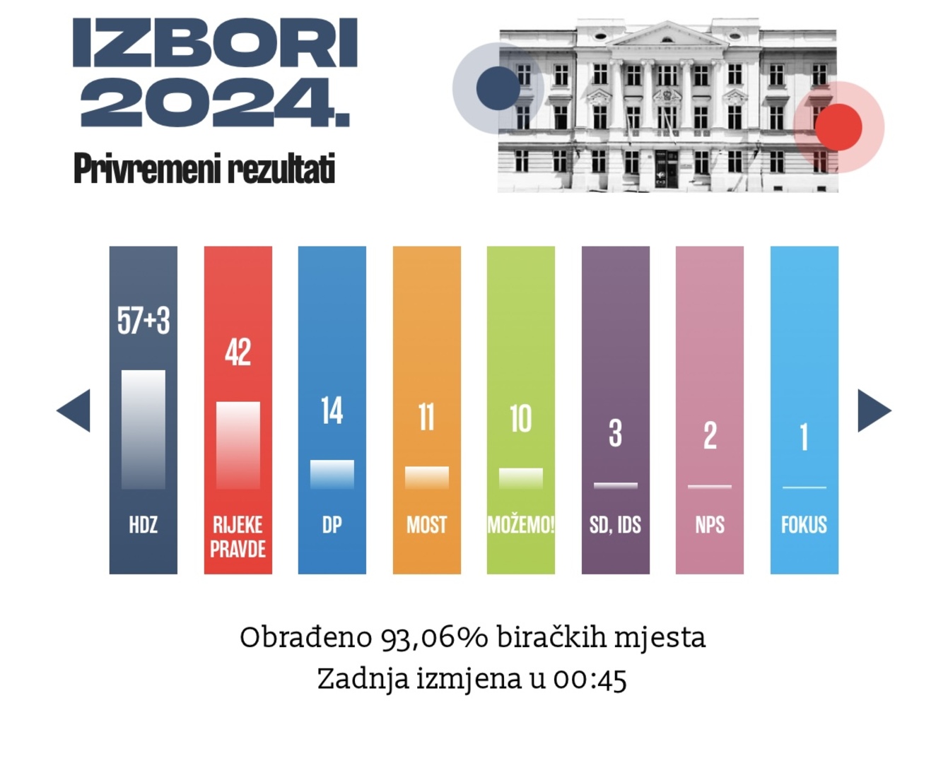 Obrađeno je gotovo 84% biračkih mjesta na izborima u Hrvatskoj, a HDZ vodi sa 60 osvojenih mandata.