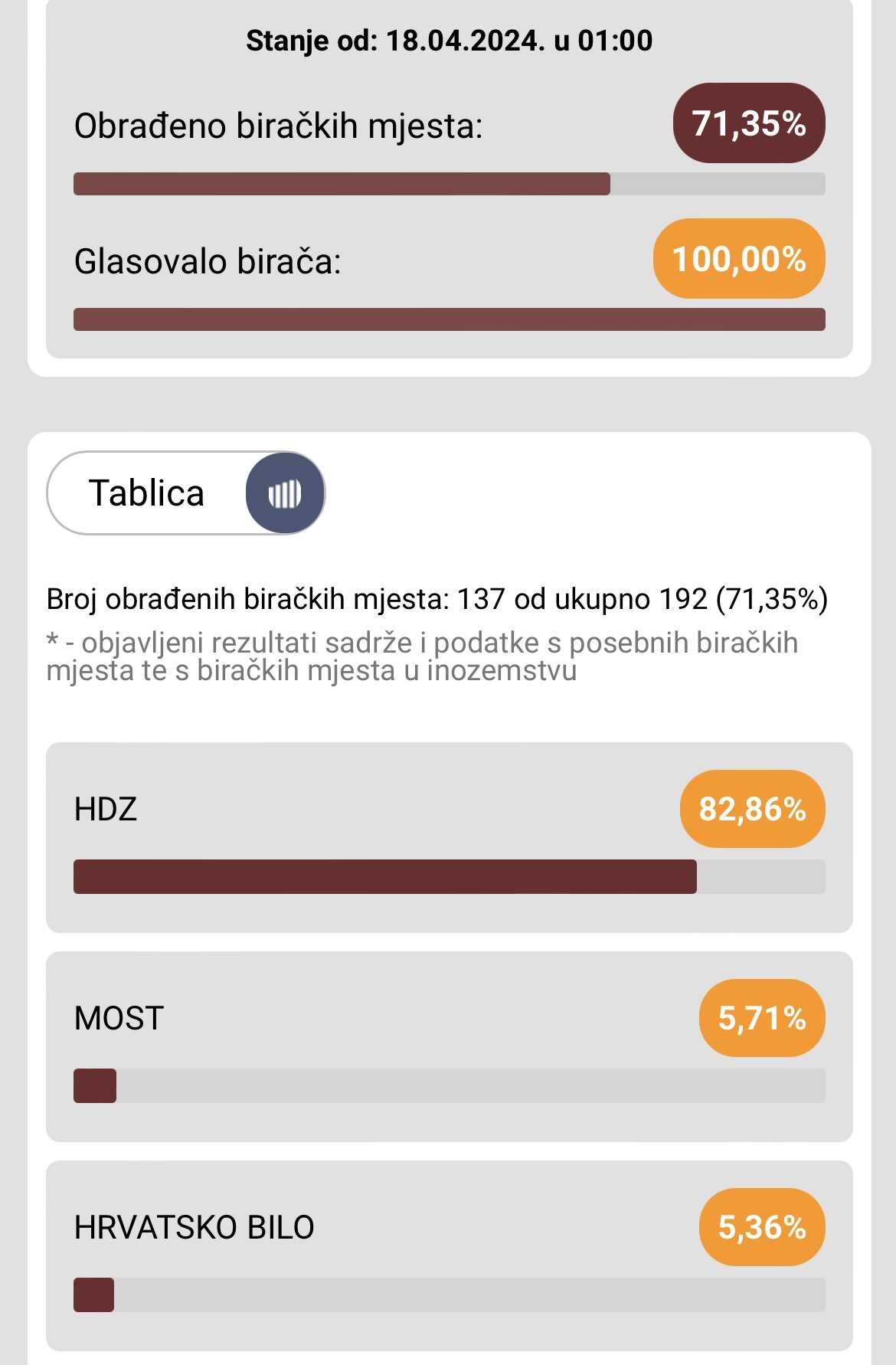 Po stanju u 00.30 sati nakon obrađenih 65.63 posto biračkih mjesta (126 od 192 biračka mjesta) HDZ-ova koalicija ima sva tri mandata, odnosno 83.12 posto glasova.